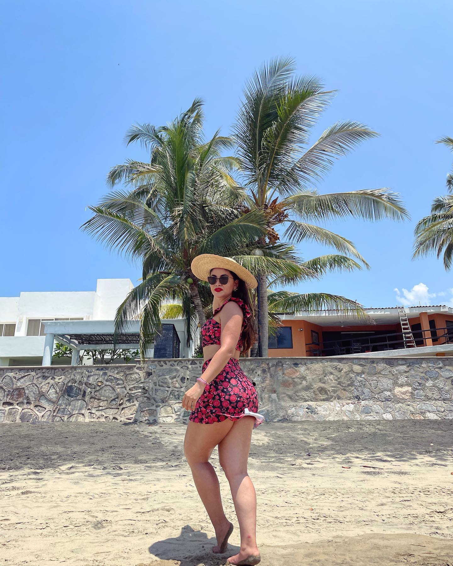 Charming and stylish, the red floral bikini set features ruffled straps for a comfortable fit. The High waist skirt provides flattering coverage, making it ideal for beach outings or poolside relaxation. This set effortlessly combines playful design with practicality for a fun summer look