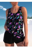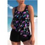 Asymmetry Black Leaf Print High Waisted Tankini Set