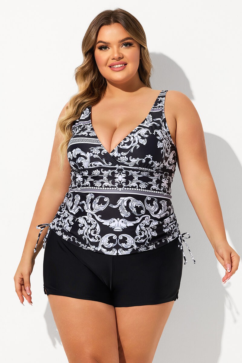 One of our best-collecting swimsuits, Black Cloudy Pattern V Neck Adjustable Strap Plus Size Tankini Set, is your best choice. The elegant tankini top features a v neck with adjustable shoulder straps, unique cloudy pattern, and drawstring details for body modification, while the black short provides flattering tummy coverage.