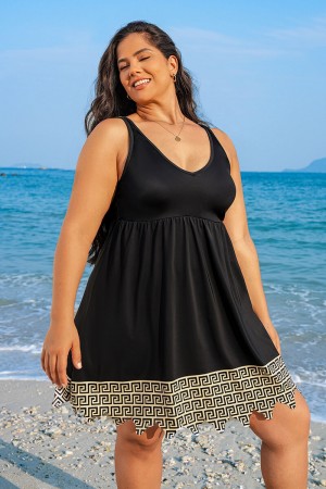 Black Gold Geometric Print Scoop Neck Thick Strap Plus Size Swimdress