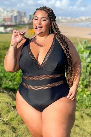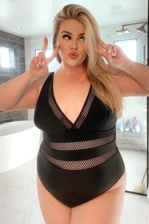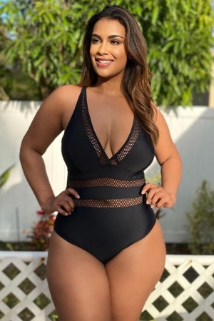 Black Mesh Plunge V-Neck OnePiece Swimsuit