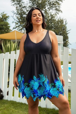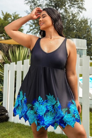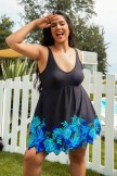 Blue Floral Border Scallop Hem Scoop Neck Plus Size Swimdress