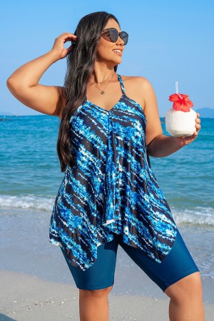 Blue Watercolor Stripe Print VNeck Thick Strap Plus Size Tankini Set