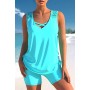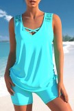 • Lace Patchwork Cross Strap Cyan Tankini Set