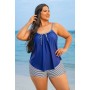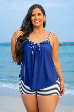 Navy Blue Bowknot Striped Women Plus Size Tankini Set