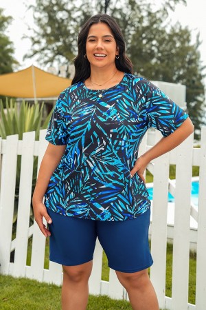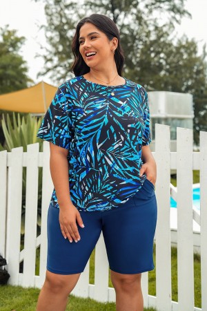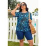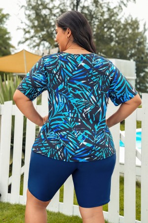 Plants Print High Neck Short Sleeves Plus Size Tankini Set