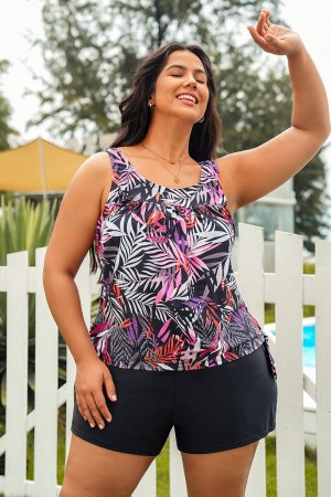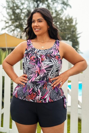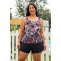 The Red Leaf Print Scoop Neck Side Tie Thick Strap Plus Size Tankini Set features a unique leaf print, a comfortable scoop neck, wide supportive shoulder straps, and side tie details adding full sporty vibes. Patching well with a solid black short.
