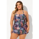 Red Tropical Leaf Print Bandeau Halter Strap Plus Size Swimdress