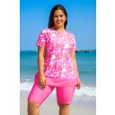 Pink Floral Print Round Neck Short Sleeve Tankini Set