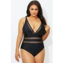 Black Mesh Plunge V-Neck OnePiece Swimsuit