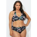 Black Floral Halter V-Neck Bikini Set