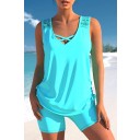 Lace Patchwork Cross Strap Cyan Tankini Set