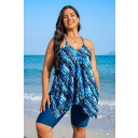 Blue Watercolor Stripe Print VNeck Thick Strap Plus Size Tankini Set