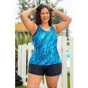 Blue Watercolor Scoop Neck Thick Strap Plus Size Tankini Set