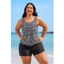 Plus Size Black And White Plants Print Side Tie Tankini Set