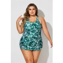 Green Flowers Print Scoop Neck Plus Size Tankini Set