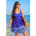 Coloful Floral Border Scallop Hem Scoop Neck Plus Size Swimdress