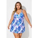 Colorful Plants Print Scoop Neck Double Straps Plus Size Swimdress