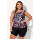 Red Leaf Print Scoop Neck Thick Strap Plus Size Tankini Set