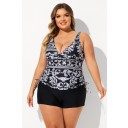 Black Cloudy Pattern V Neck Adjustable Strap Plus Size Tankini Set