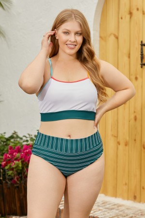 White Flattering Scoop Neck Bikini Top And Blue High-Waist Bottom Sets features a classic white bikini top with a Flattering Scoop Neck , and backless design. Patching a high-waist bottom for a perfect beach look.