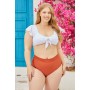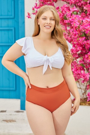 The White V Neck Sleeves Knot Front Backless Bikini Top And Red High-Waist Bottom features a feminial bikini top with a bold v neck, knot front details adding cute vibes, and backless design with double S-hooker closure. Patching with a high-waist bottom for enough tummy control.